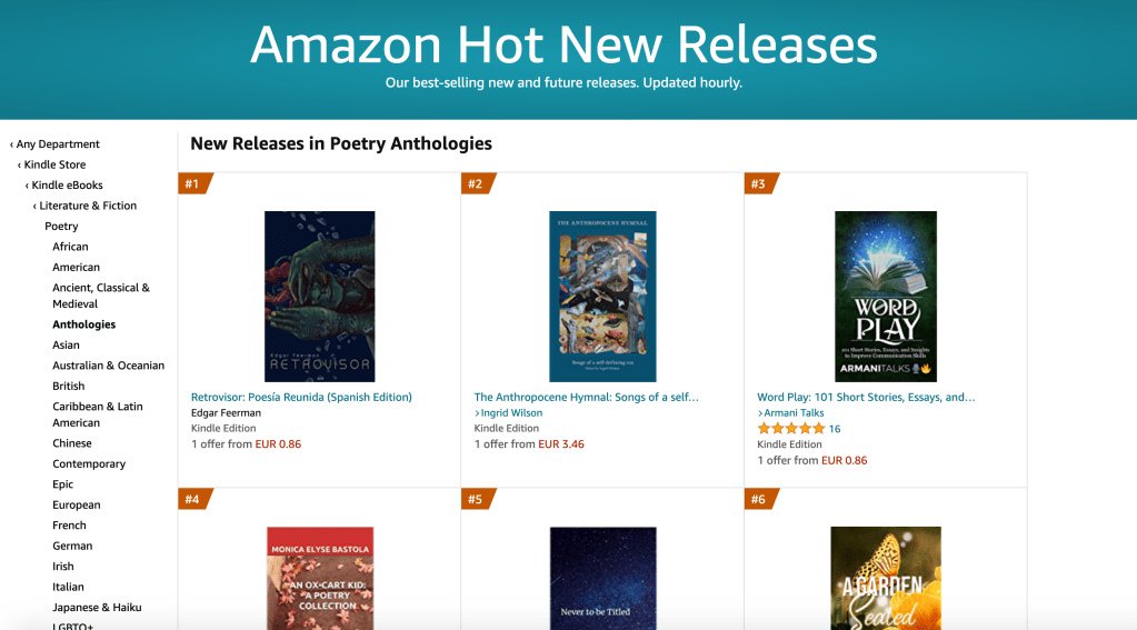 To everyone who has pre-ordered The Anthropocene Hymnal from Amazon, sending it to #2 in new poetry releases before it has even been released! I am truly thrilled and full of gratitude to everyone who has contributed or in any way shown their support for this project.