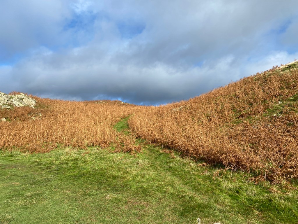 If you are not looking for a mountain climb, Loughrigg Terrace makes a fine walk in itself, and ends at Rydal Water, close to Wordsworth’s Rydal Mount residence. For our walk, however, the path ahead is a steep stone staircase, which my six-year-old son raced up, leaving me struggling to keep up with him! The climb eases as the horizon is reached, though the summit is still somewhat distant at this point (ah β the ‘false horizon’ β all Lake District fellwalkers must know it well!)
