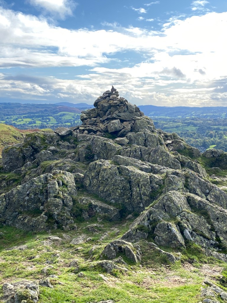 The highest point of the fell is marked by an Ordnance Survey trig point. From here, descend by the main path heading south, away from Grasmere. There are rocky outcrops all along the route, affording stunning views of the Langdale valley to those who visit them. Just take care not to lose the path altogether, as there are still steep slopes around, which can be perilous in poor weather.