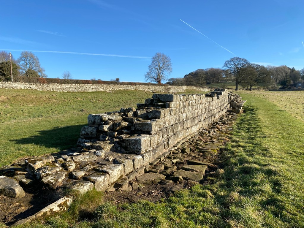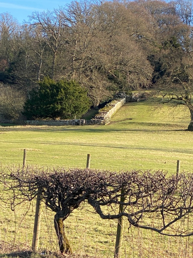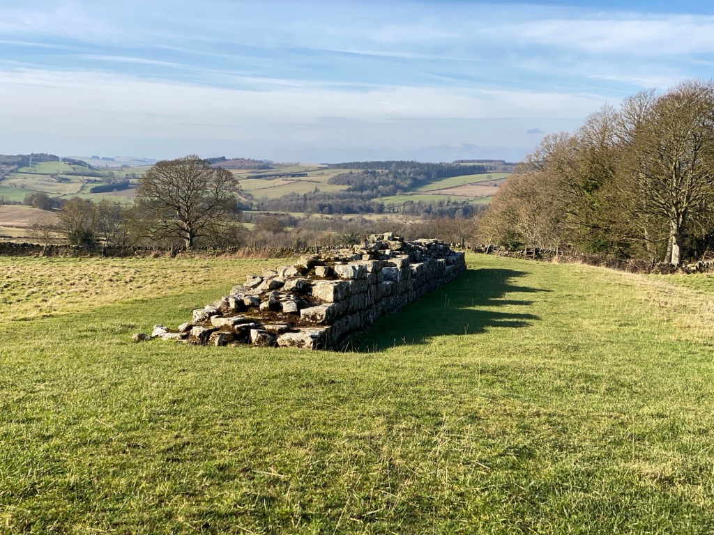 I was so grateful for this bus, as we drove up the steep slopes of the hills north of Hexham which would take us back into Wall country. Having to make the hike up there ourselves would have severely impeded our progress! The walking was relatively easy along this section; the skies open and bright. Everywhere, we witnessed signs of the approaching spring: the sun, once risen, was much warmer than the low sun of January had been. Snowdrops were flowering in the woodlands. We were even able to remove our winter jackets for a while! The views to the north were expansive, taking in the Northumbrian wilds and the Scottish Borders. I couldn’t help but think that, in building the Wall, the Romans had cut themselves off from some of the finest parts of the land. No doubt the native Celtic tribes were happy to be left to continue their uncivilised ways, north of the frontier!